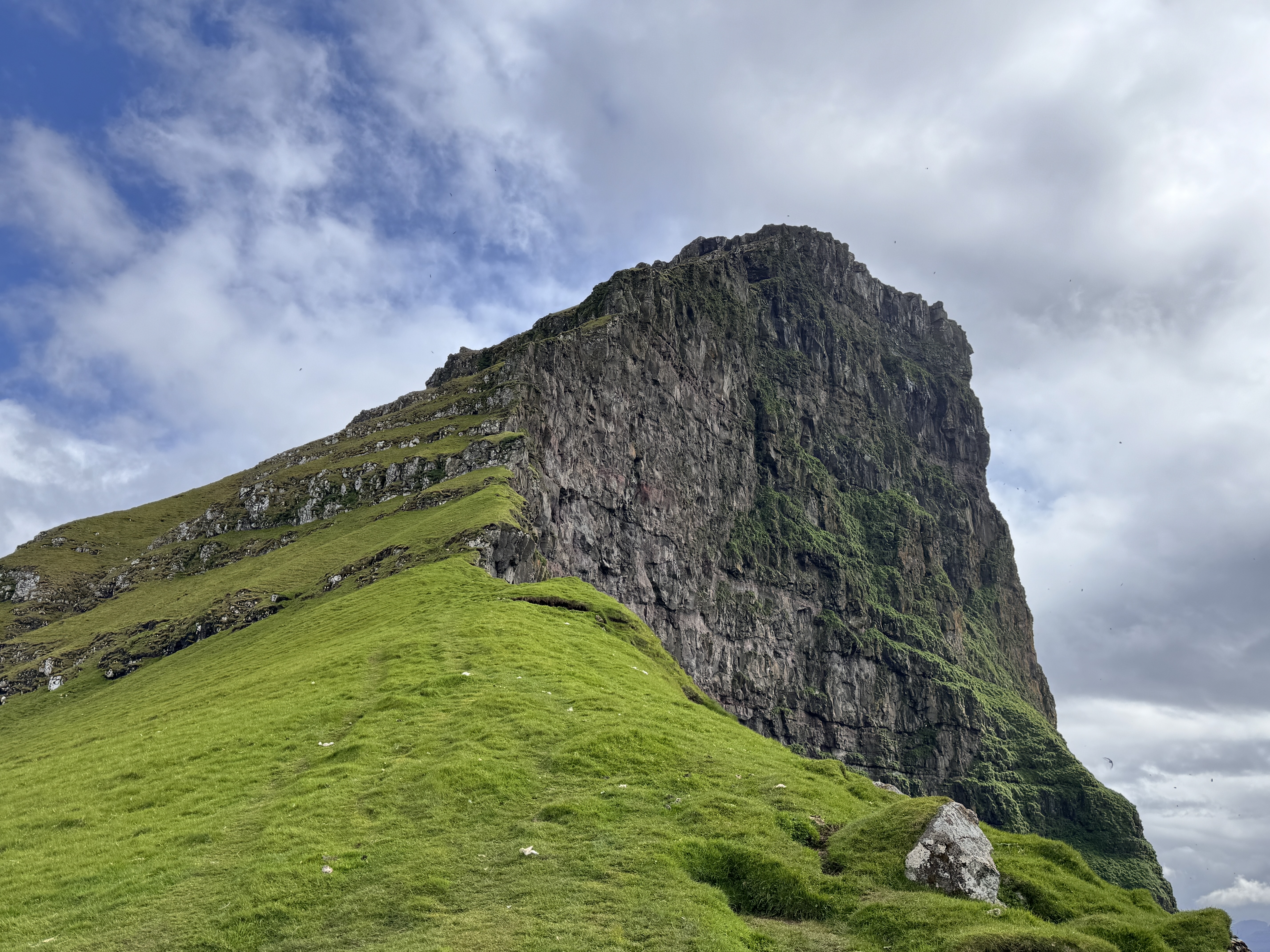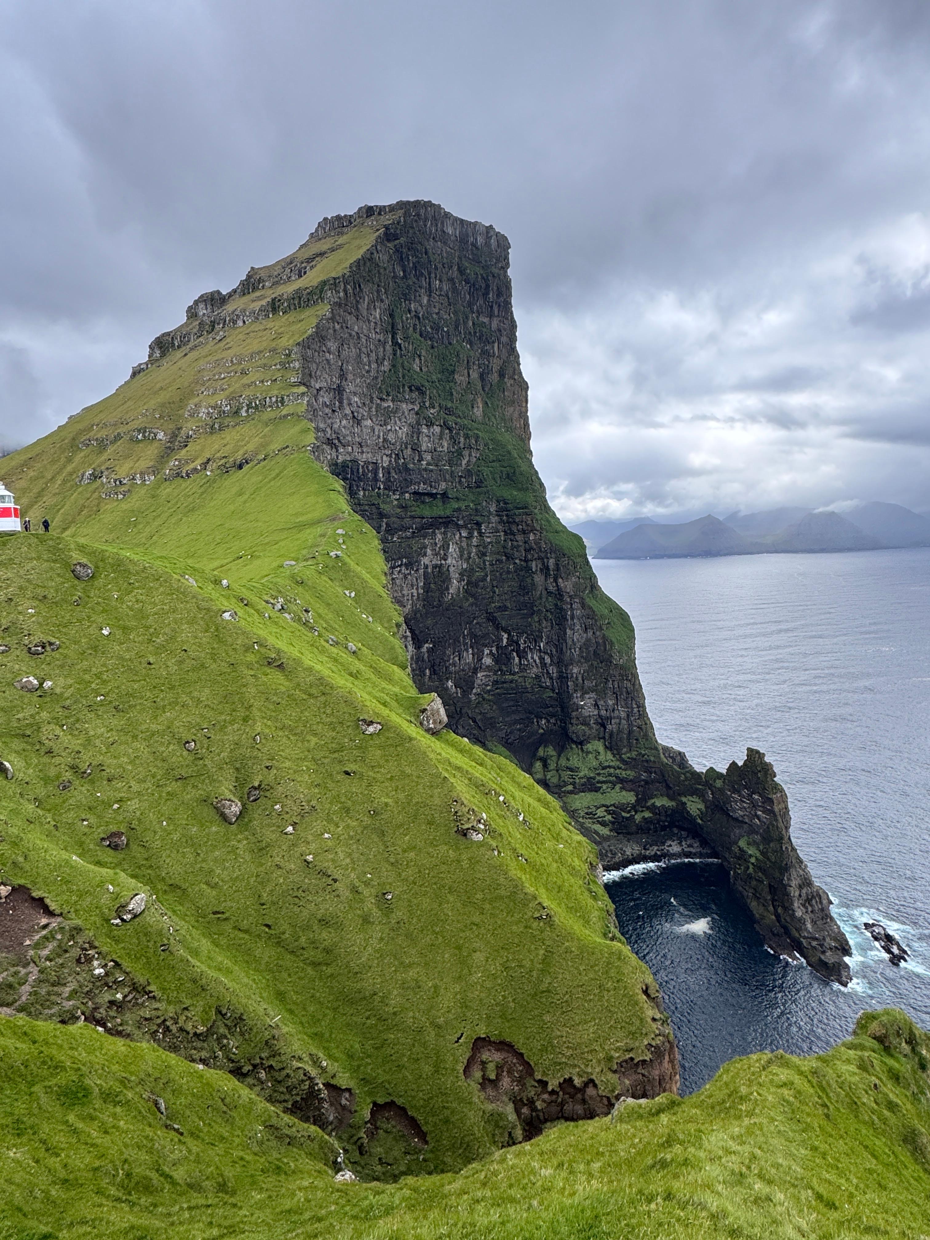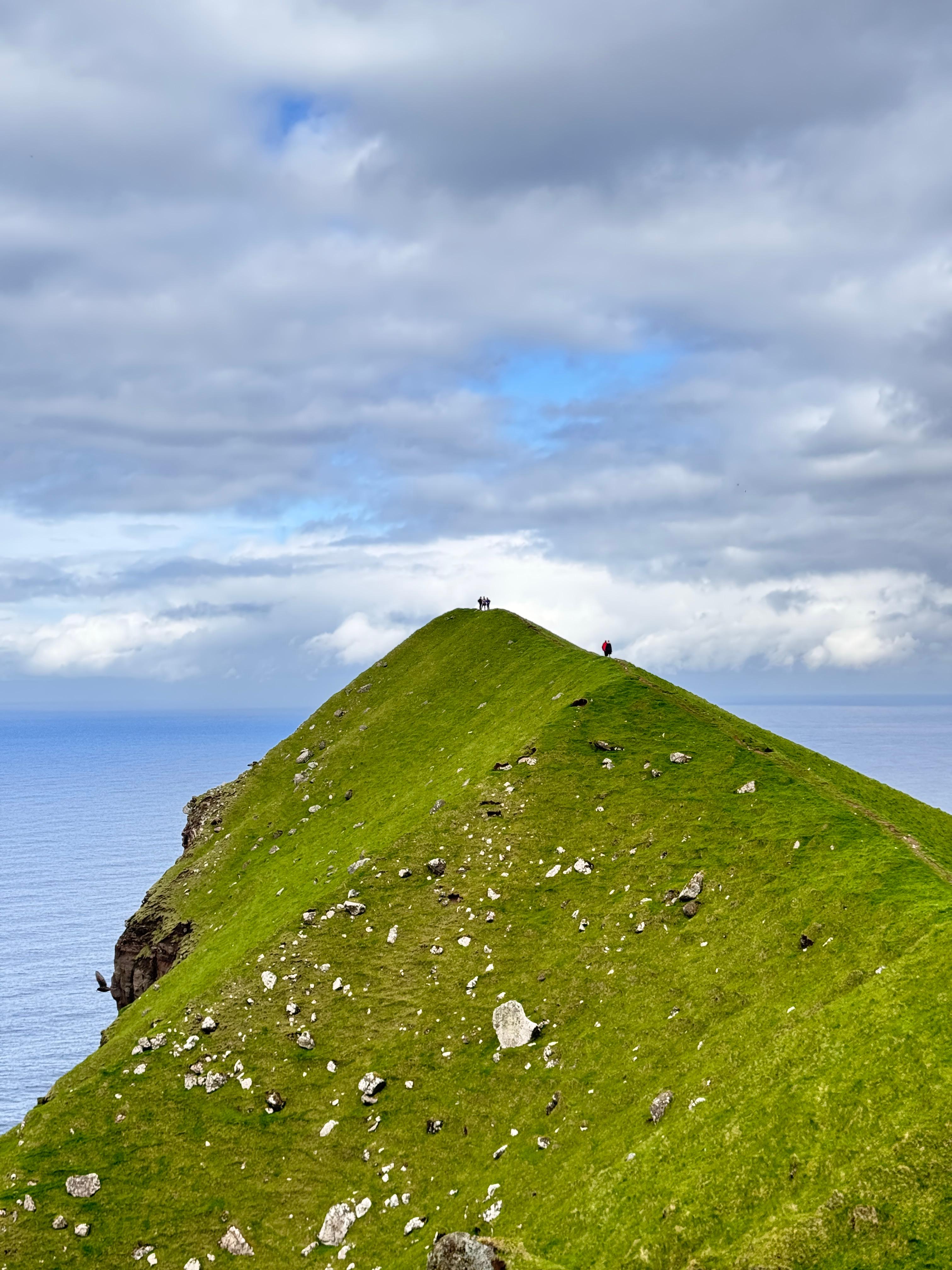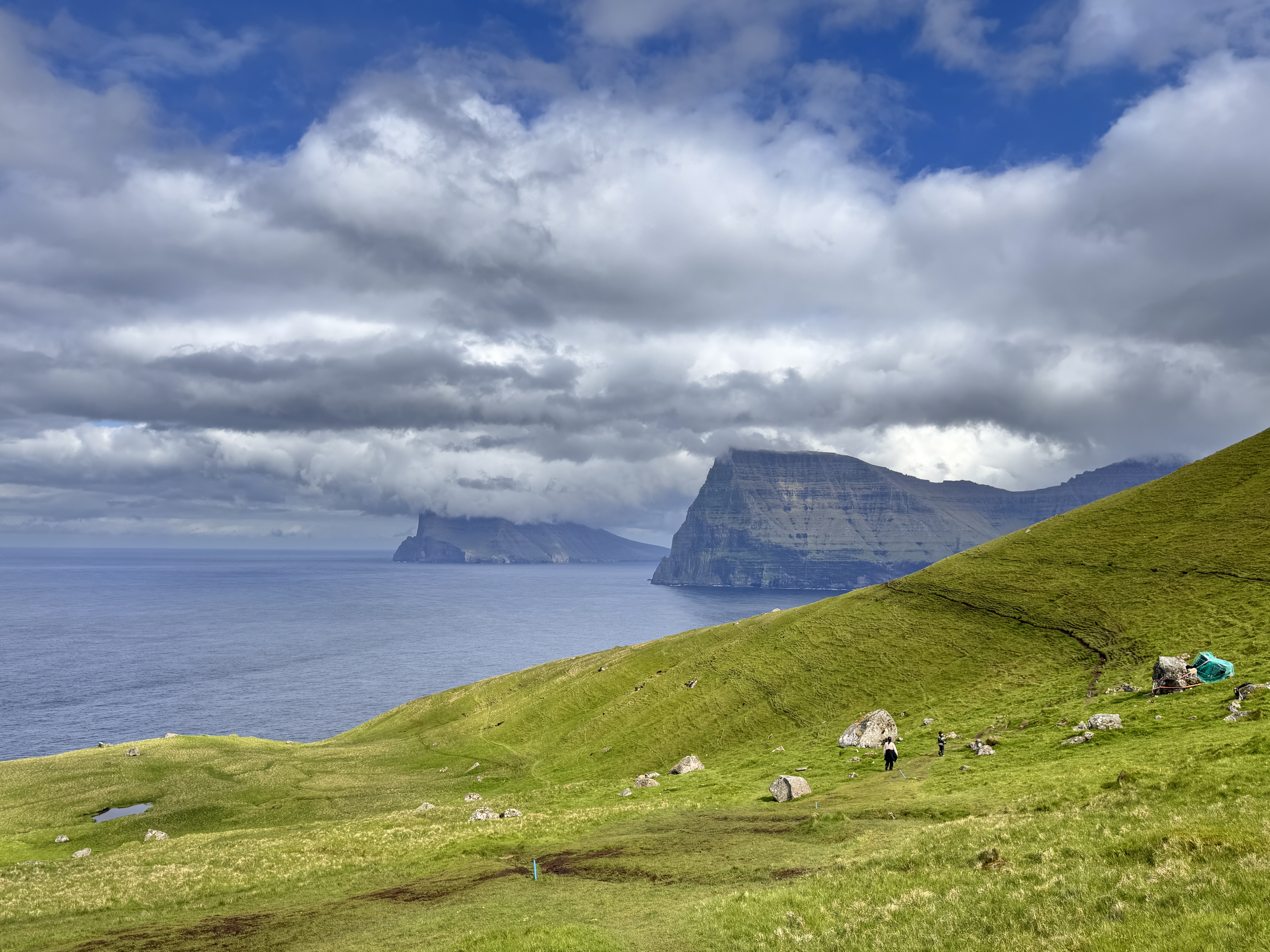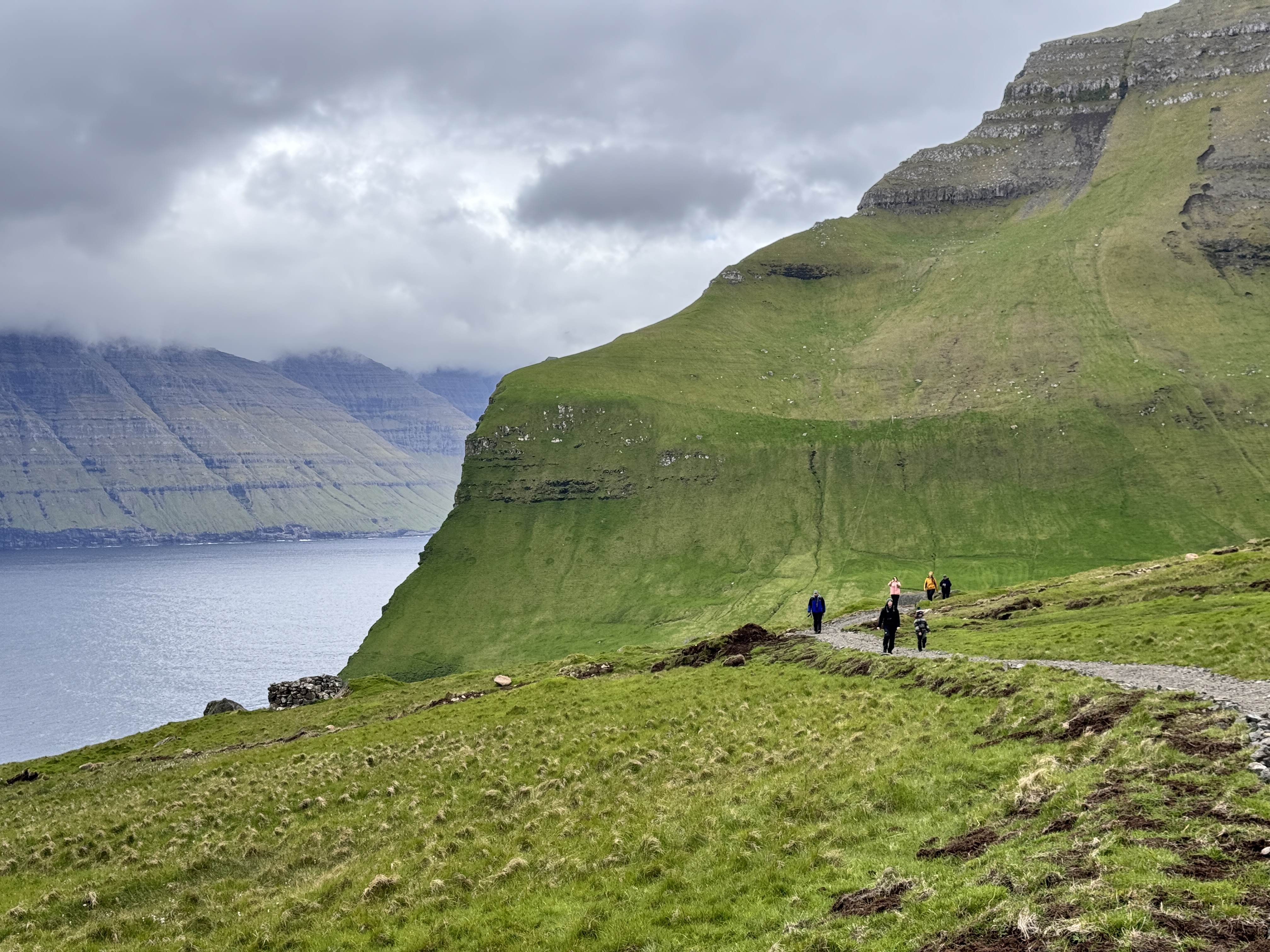 30분 정도 오르다보면 도착할 수 있다. 생각보다 많은 사람들이 정상 부근에 올라 페로 제도의 특이한 지형을 보러 하나 둘 모여있었다. 며칠 째 봐도 참 신기하고 특이한 풍경의 페로 제도이긴 하다.10분 간 멍하니 페로 제도의 볼록하게 튀어나온 침식 지형과 흐리지만 녹음이 짙은 풍경을 바라보고 왔던 길 그대로 내려왔다. 원래 목적지인 칼소이 섬으로 이동하여 또 다른 구경을 이어나가고자 했다.