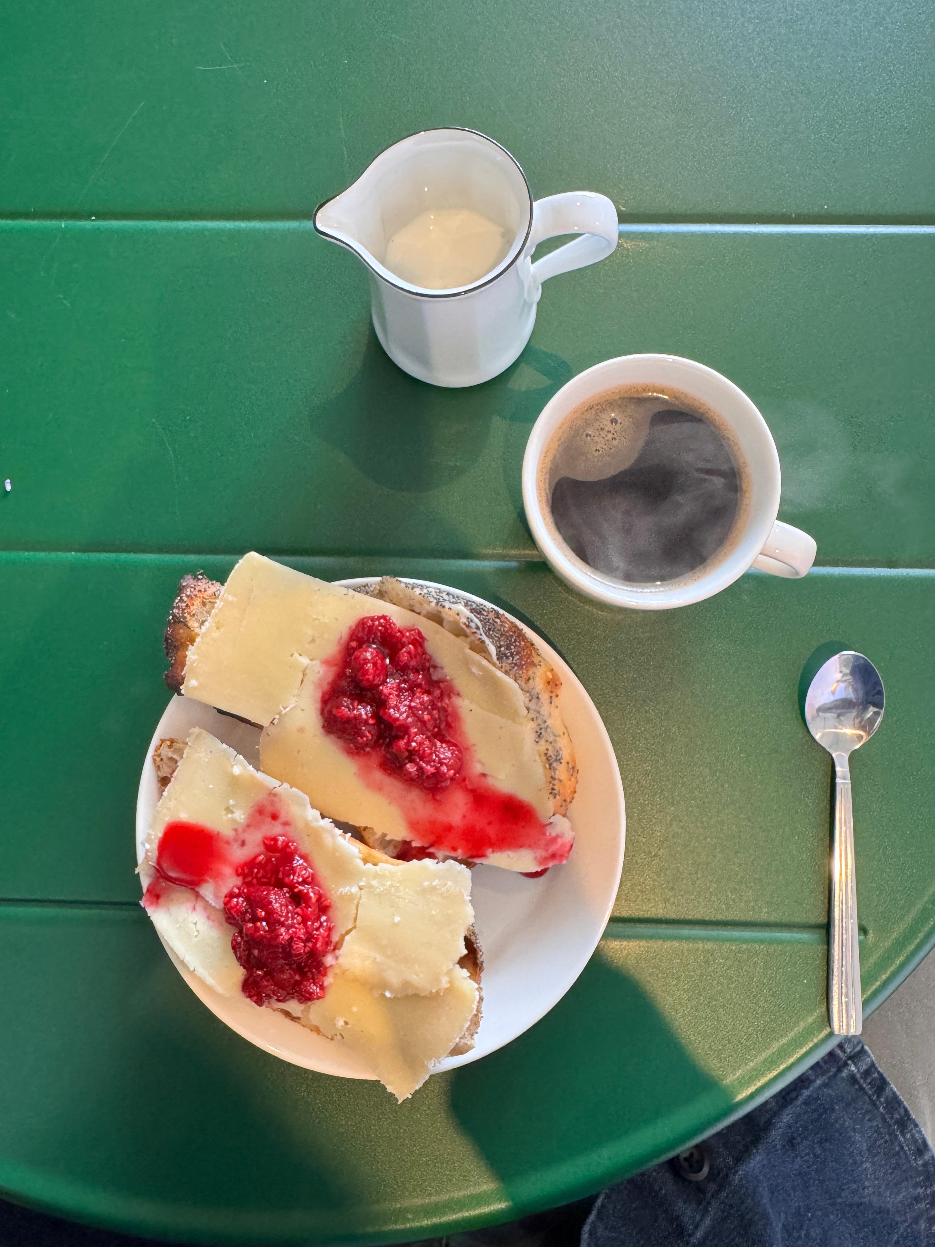 주문한 커피와 샌드위치가 나왔다. 선명한 초록색 테이블 위에 놓인 검은 아메리카노 한 잔. 그리고 버터와 치즈, 라즈베리 잼이 조화롭게 올라간 오픈 샌드위치. 톡톡 터지는 라즈베리의 새콤달콤함과 고소한 치즈가 커피의 쌉쌀함과 잘 어울렸다.